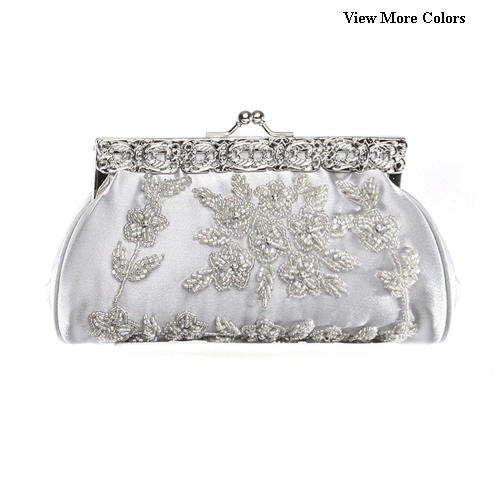 shown in luxurious silver satin adorned with bugle beads and seed beads in