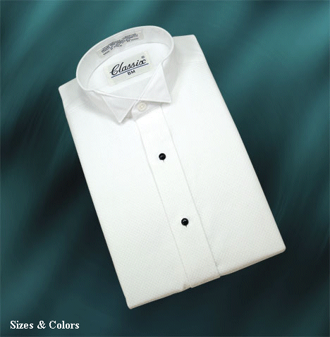 Boy's pique tuxedo shirt style B07 is made with 186 T/C 65/35 polycotton fabric with convertible stud front and barrel cuffs. B07 has a wing collar with pique front.
