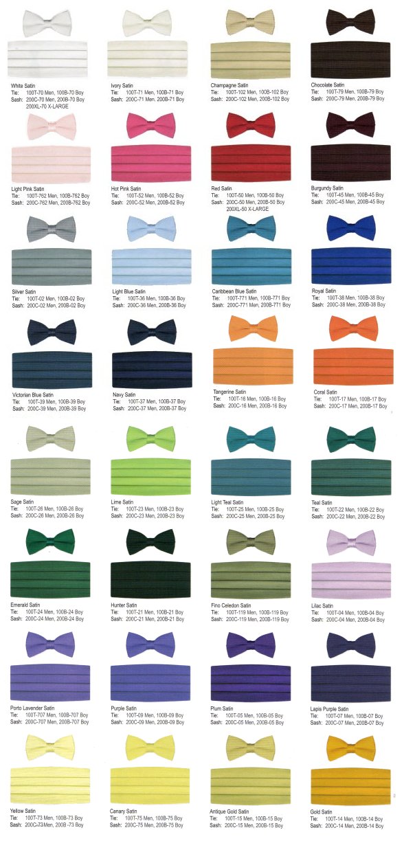 Satin Cummerbund & 2 1/2" Bow Tie Sets. Poly satin bow tie with sliding adjustable band and poly